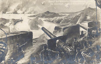 The Turk sticks to his guns, and it is necessary to land a shell on the gun itself. Many shells go close and on earthworks do little or no harm at all. - Stewart & Peshall HMS Cornwallis