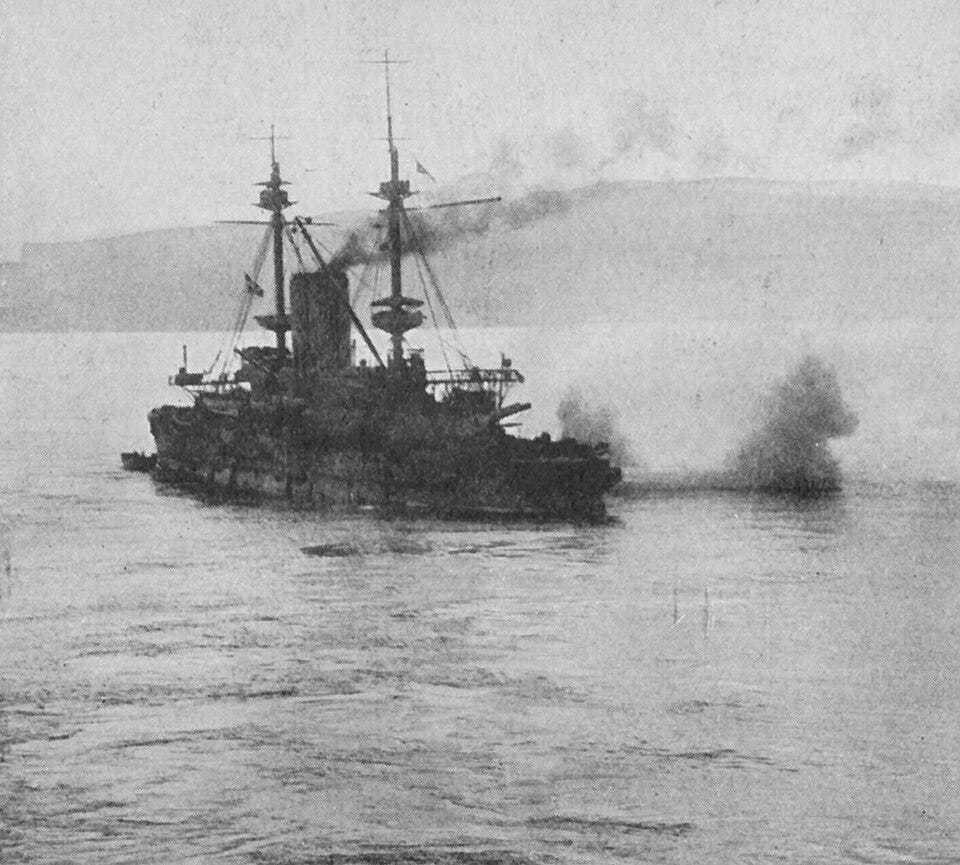 We proceeded slowly up the Straits, opening fire on various places that might possibly conceal troops or batteries. For a time we did as we liked, but as we made progress we gradually came under fire from Turkish batteries. Now and again would come a flash from behind the hill and then the dull “woof” of the shell as it struck the land behind us or exploded on contact with the sea. Sometimes the impact with the water was not enough to detonate the shell- - dependent upon the style of fuse mechanism, I suppose - and all that happened was a sudden perpendicular jet of water. The real excitement came when the first enemy shell found its target, and the old ship quivered with the explosion. That ought to have been sufficient to keep every one below except those whose duty compelled them to remain on deck, but it had precisely the opposite effect. Every man who was not on duty scampered up to see the “fun”; most of them seemed to regard it as a kind of regatta, and the captain repeatedly had to order them below. But still they creapt up, filled with an insatiable curiosity. - Petty Officer Cowie HMS Majestic